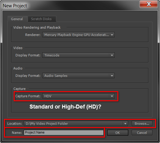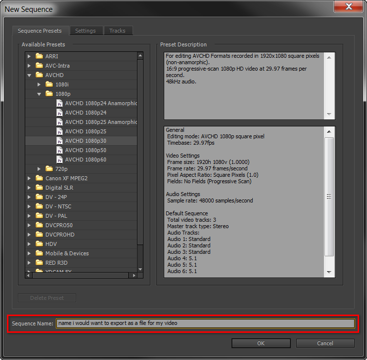 Note: This particular step isn’t as critical so don’t spend a lot of time trying to figure out what kind of footage you have. Premiere can fix this automatically for you. When you drag a piece of footage to your timeline later and it doesn’t match the settings for the sequence, Premiere will alert you of the mismatch and will ask if you want Premiere to adjust the sequence settings for you. As long as you don’t downgrade your sequence to a lower quality than your highest quality footage, it’s fine to allow Premiere to make the fix.