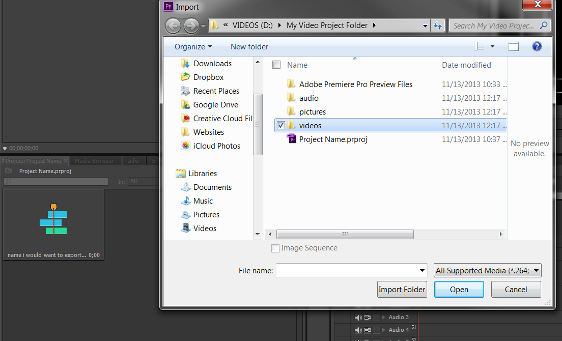 If you already have digital video files on your computer hard drive, you can import them to your Adobe Premiere project. Locate the video files on your computer hard drive, external hard drive, or flash drive.